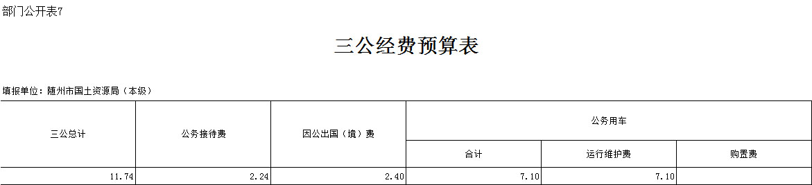 隨州市國土資源局本級2018年度 三公經費預算合計11.74萬元,其中:因公出國(境)預算2.4萬元,比去年8.4萬元減少6萬元,減少比例71.43%,主要原因是出國人次減少;公務接待預算2.24萬元,比去年2.31萬元減少0.07萬元,減少比例3.03%,主要原因是根據當年人員編制情況及標準測算的結果;公車運行維護預算7.1萬元,比去年10.1萬元減少3萬元,減少比例29.7%,主要原因是公車運行維護次數減少;公務用車購置費2018年度無預算安排。