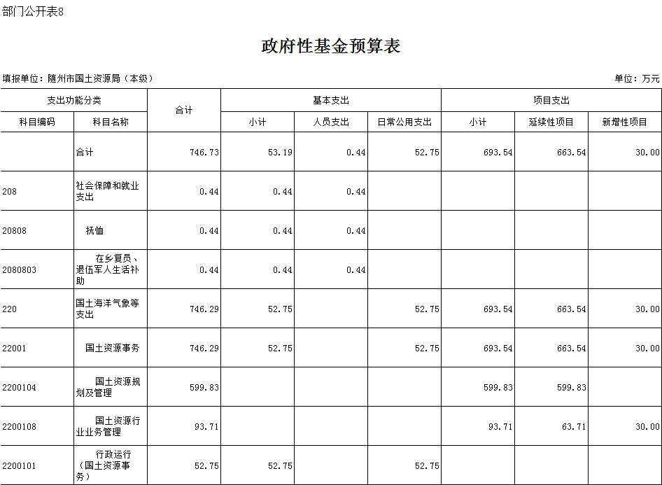 隨州市國土資源局本級2018年度政府性基金預算合計746.73萬元,比上年度預算總額安排868.72萬元減少121.99萬元,減少比例14.04%。主要原因是減少了規劃修編、集體土地確權等項目收入。