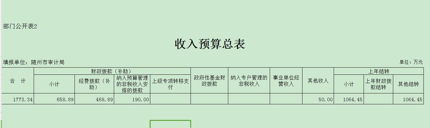 2018年市審計局收入預算總計1773.34萬元,主要有:經費撥款(補助)468.89萬元、納入預算管理的非稅收入190萬元、其他收入50萬元、上年結轉1064.45萬元。較上年收入預算安排減少99.26萬元,減少比例5.30%,減少的主要原因:根據部門2017年實際非稅收入取得情況,減少了納入預算管理非稅收入的預算。