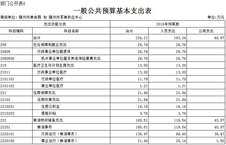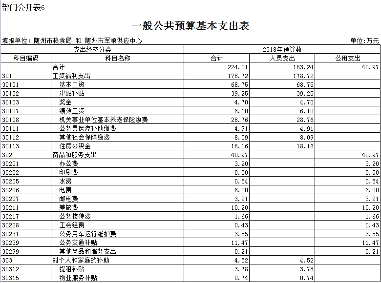 2018年糧食部門財政撥款預算支出總額為644.21萬元,比上年預算安排743.09萬元,減少98.88萬元,同比減少13.31%,減少主要原因是2017年隨州市糧食質量監測站整體劃給了隨州市公共檢驗檢測中心和預算中不包含退休人員的工資及職工獎勵性工資。按功能分類:機關事業單位基本養老繳費支出28.76萬元,行政事業單位醫療13萬元,住房公積金18.16萬元,提租補貼3.78萬元,行政運行138.87萬元,事業運行24.64萬元,儲備糧油補貼417萬元(其中上級專項轉移支付105萬元)。