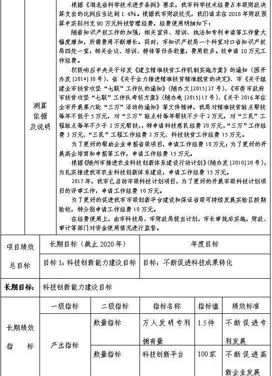 4.項目支出(技術(shù)創(chuàng)新服務體系2060502項):指在基本支出之外為完成特定行政任務和事業(yè)發(fā)展目標所發(fā)生的支出。18年列支科學技術(shù)管理事務專項活動經(jīng)費,科技部門開展科技成果轉(zhuǎn)化、高新技術(shù)企業(yè)申報、省級以上創(chuàng)新平臺建設(shè)、專利申報等獎勵,市本級支持企業(yè)技術(shù)創(chuàng)新研發(fā)項目等支出。
