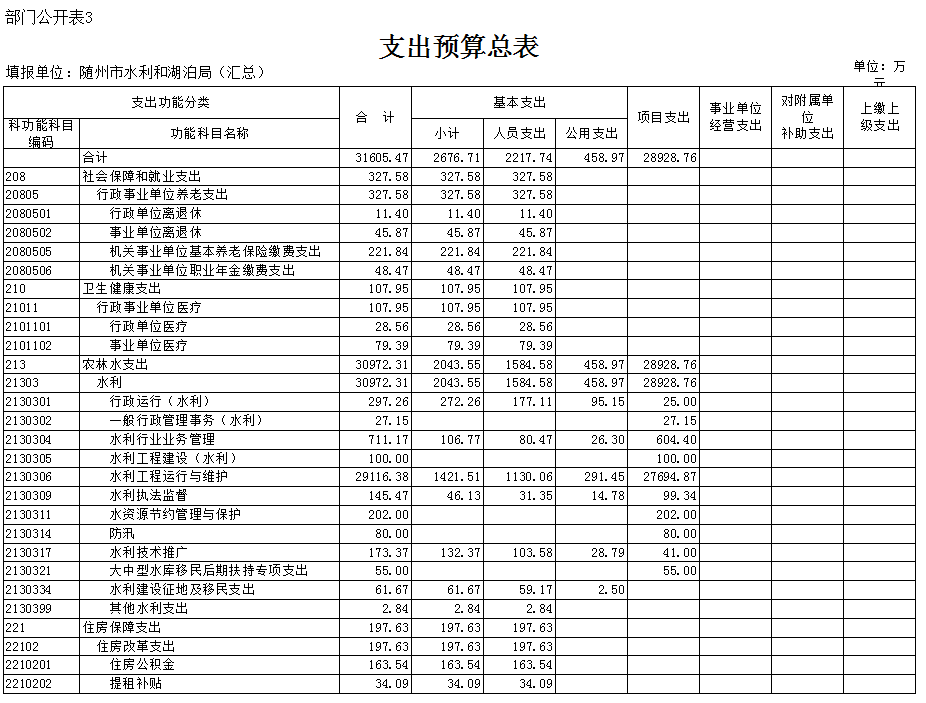 2020年,局系統匯總支出31605.47萬元,比上年5896.44萬元增加25709.03萬元,增加436 %,增加的主要原因是白云湖水環境提升工程和梁家橋水生態聯通工程項目支出。其中社會保障險和就業支出327.58萬元,醫療衛生支出107.95萬元,農林水事務支出30972.31萬元,住房保障支出197.63萬元。