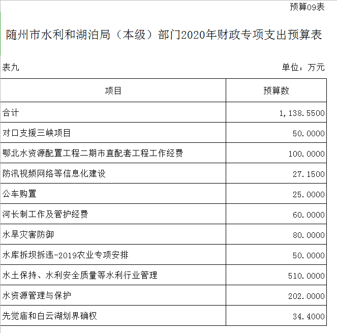 2020年納入部門預算管理單位8個,隨州市水利和湖泊局(本級)、水政監察支隊、水利技術推廣中心、河道堤防建設管理局、先覺廟水庫工程管理局、白云湖水利工程管理局、隨中灌區管理局、市移民局。