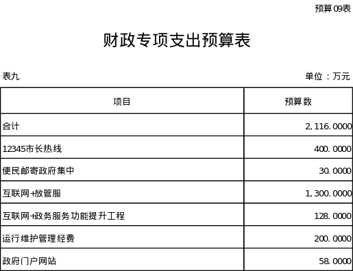 項目主要內容 | 明確當年申請預算資金的主要投向及工作任務: 1、建設政府門戶網站集約化 ; 2、12345移動服務及智能應用; 3、 工程建設項目審批管理系統。 | ||||||||||||||||||||||