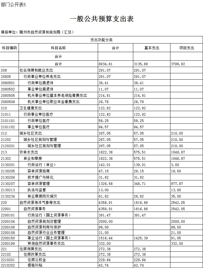 五、一般公共預算支出表
