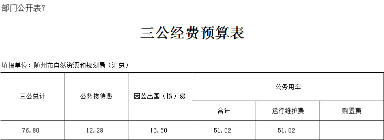 隨州市自然資源和規劃局2020年度系統匯總三公經費預算合計76.8萬元,其中:公務接待費12.28萬元,因公出國(境)費為13.5萬元,公務車運行維護費為51.02萬元, 公務用車購置費2020年度無預算安排。隨州市自然資源和規劃局為2019年4月新組建單位,納入部門預算管理的單位共18個,無上年對比數據。