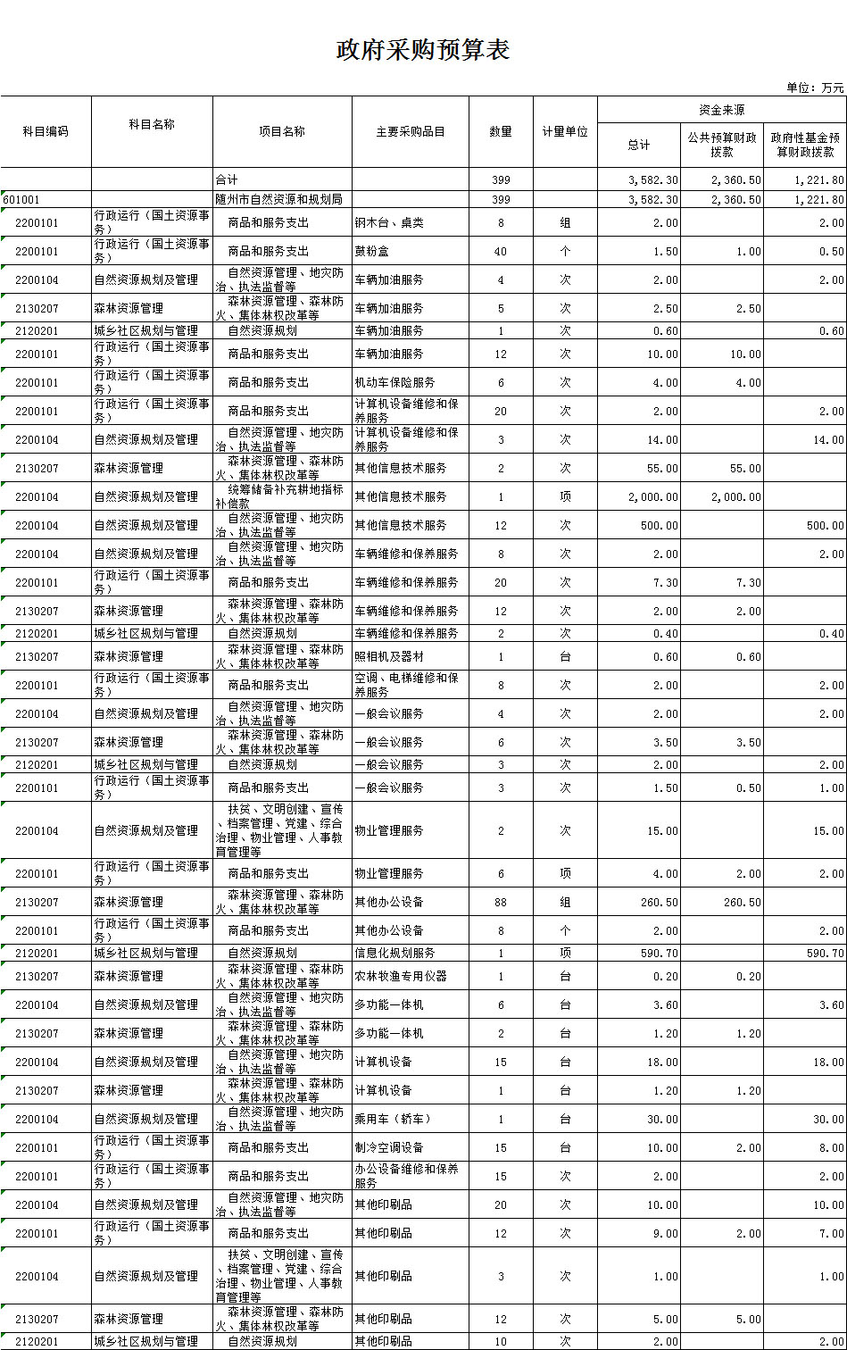 隨州市自然資源和規劃局2020年度政府采購年初預算金額總計3582.3萬元:其中服務類3224.5萬元(主要包括其他信息技術服務2555萬元,信息化規劃服務590.7萬元,車輛保養加油、會議、物業管理等服務78.8萬元),貨物類357.8萬元(主要包括森林防火專用設備260.5萬元,空調、計算機、打印機、辦公桌、鼓粉盒等貨物類97.3萬元)。隨州市自然資源和規劃局為2019年4月新組建單位,無上年對比數據。