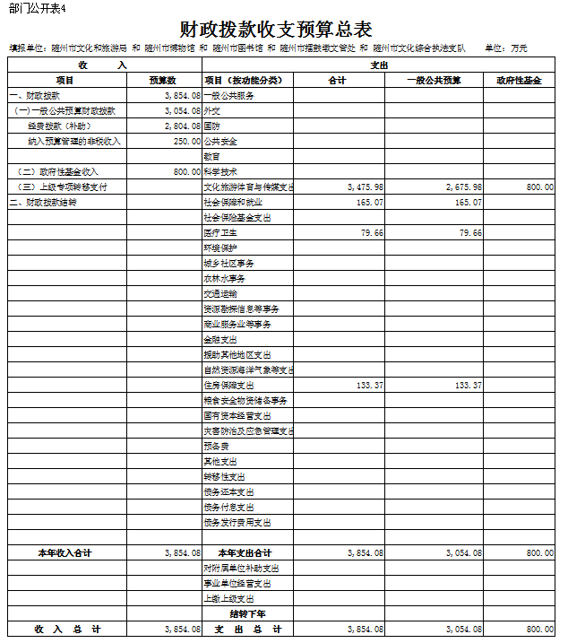 匯總財政撥款(補助)支出預算數為3054.08萬元,較上年預算安排2574.54萬元,增加479.54萬元,增幅18.63%,增加的原因主要是2019年機構改革,部門合并,原隨州市外事僑務旅游局和隨州市文化體育新聞出版廣電局部門項目合并。???