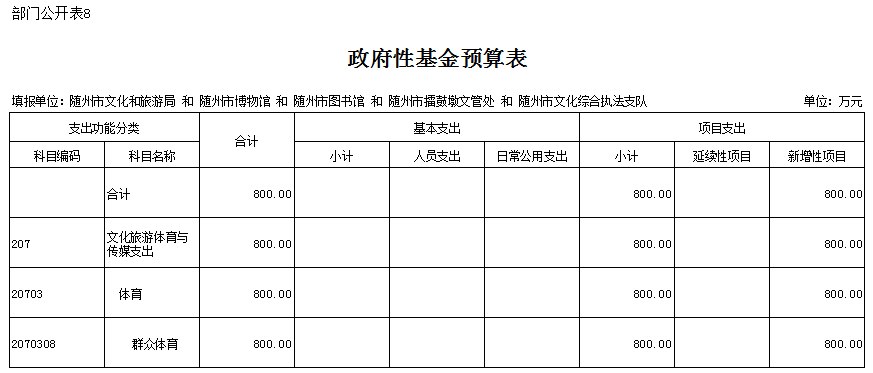 ????匯總政府性基金財政撥款支出預算數為800萬元,較上年預算安排100萬元,增加700萬元,增幅700%,增加的原因主要是根據要求,2020年將政府性基金納入預算管理。