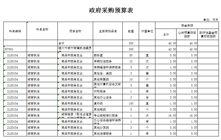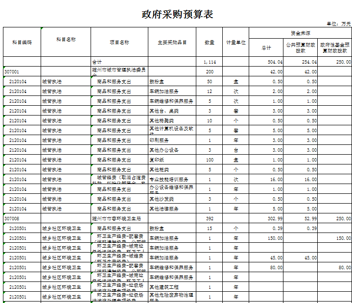 ??2020年城管執(zhí)法委系統(tǒng)政府采購預(yù)算金額為1208.55萬元,比上年減少789.3萬元,減少39.51%,主要為環(huán)衛(wèi)垃圾滲濾液和專項設(shè)備購置等政府采購支出。