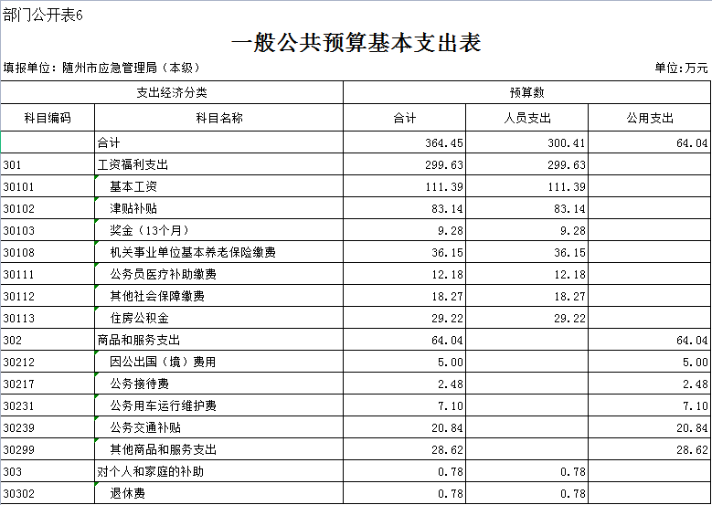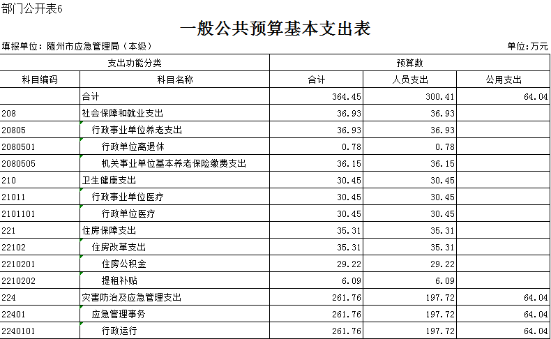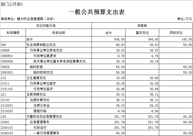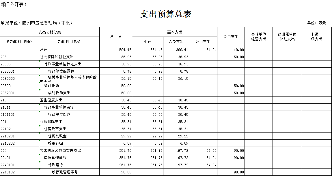 本年部門支出預算總額504.45萬元,其中:行政運行預算金額364.45萬元(其中人員支出300.41萬元、公用支出64.04萬元)、應急管理項目預算金額140萬元,歸口管理的行政單位離退休預算金額0.78萬元、機關事業單位基本養老保險繳費預算金額36.15萬元、行政單位醫療預算人員支出金額30.45萬元、住房公積金29.22萬元、提租補貼6.09萬元。較上年預算安排增加了50.52萬元,比上年預算安排增加了11.13%,主要原因為機構改革增人增資安排預算收入有所增加。