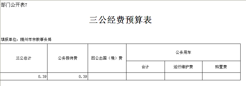 2019年隨州市民宗局“三公”經費年初預算安排0.39萬元,與上年預算比較無增減變化,其中: