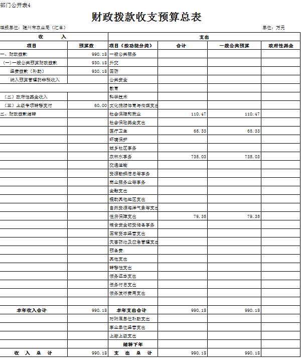 2019年隨州市農業局(匯總)財政撥款支出預算990.18萬元,比2018年1117.47萬元減少127.29萬元,減少11.39%,主要原因是壓縮了財政撥款支出的項目支出。其中:基本支出832.18萬元,比2018年790.47元增加41.71萬元,增加5.28%,主要原因是人員調資增加的支出;項目支出158萬元,與2018年327萬元減少169萬元,減少51.68%,主要是壓縮了財政撥款支出的項目支出。