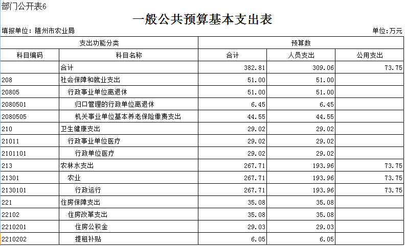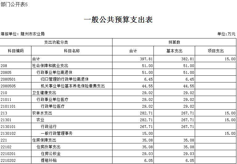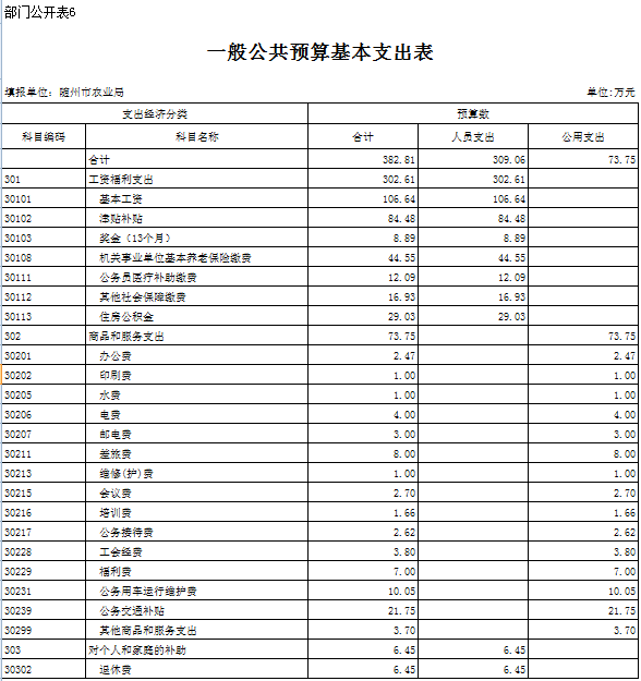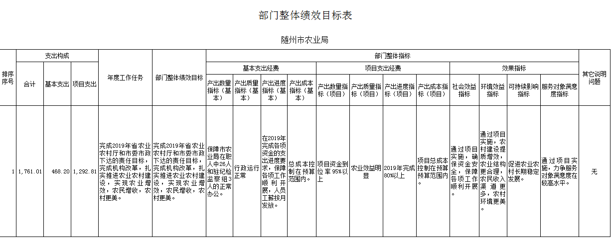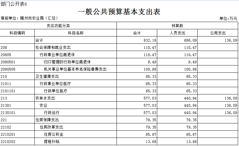2019年納入部門預算管理的二級單位有六個,分別是隨州市畜牧獸醫局、隨州市經管局、隨州市農機局、隨州市水產局、隨州市蔬菜辦、隨州市農業行政執法支隊。