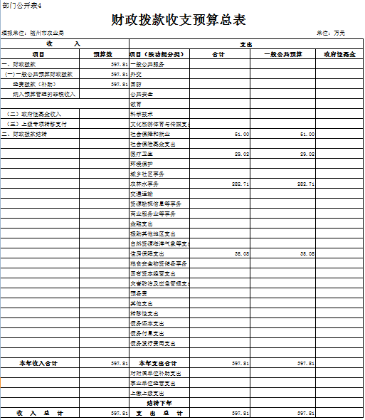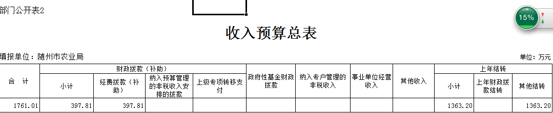 市農業局本級2019年度收入預算總額1761.01萬元,比上年909.3萬元增加851.71萬元,增加93.67%,主要原因是上年結轉。其中:財政撥款預算收入總額397.81萬元,比上年380萬元增加17.81萬元,增長4.69%,增長原因是人員調資。其他收入0萬元,與上年同;上年其他結轉1363.2萬元,同比增長833.90萬元增長157.55%,主要原因是部分項目結轉2019年繼續實施。