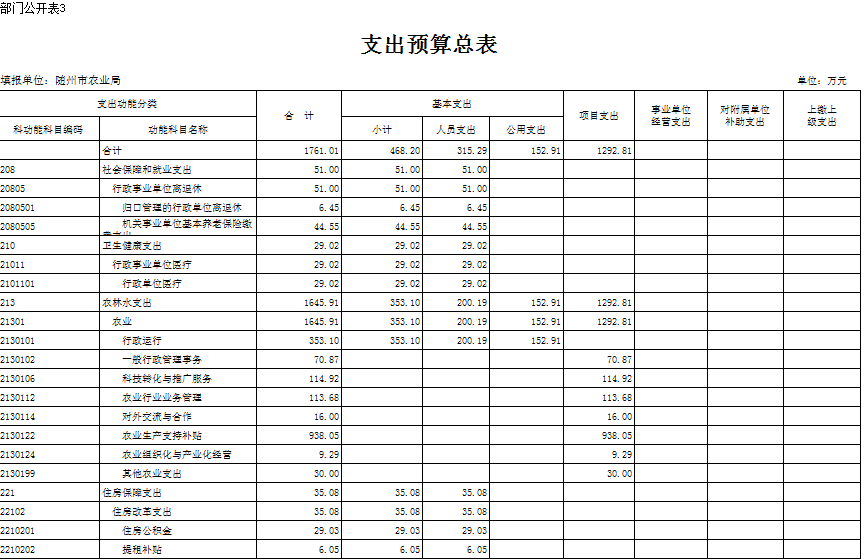 市農業局本級2019年度支出預算總額1761.01萬元。比上年909.30萬元增加851.71萬元,增加93.67%,主要原因是加大對特色農業、農產品加工的扶持力度。按資金性質分: