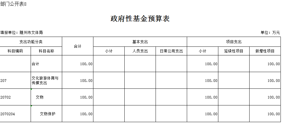 2019年預算中,財政預算隨州市文化體育新聞出版廣電局系統政府性基金100萬元。局本級政府性基金100萬元,比上年增加100萬元,增加原因是財政將體彩公益金統一調配使用,用來預算項目支出。