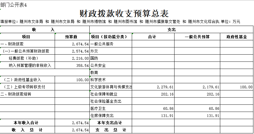 2019年預算中,隨州市文體系統財政撥款預算支出2674.54萬元,比上年增加433.58萬元,上升19.35%,上升原因是項目財政撥款增加。局本級663.2萬元,比上年增加275.16萬元,上升70.91%,項目增多。