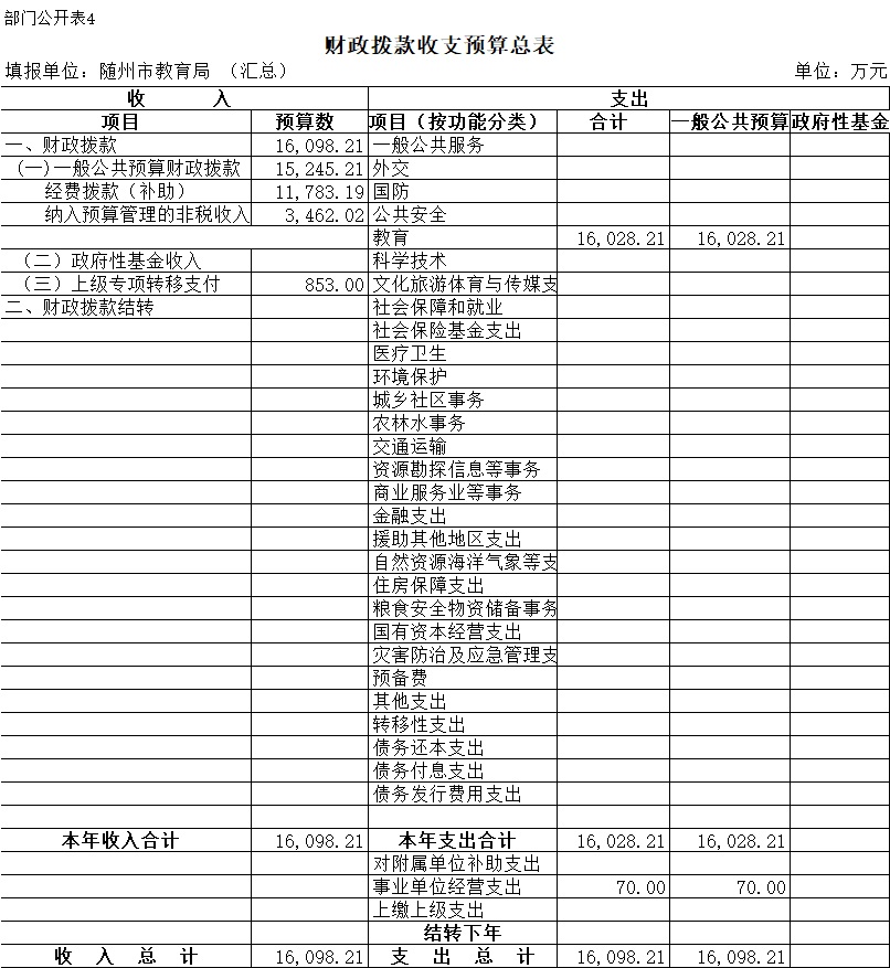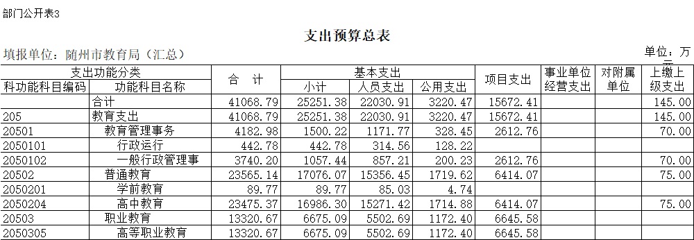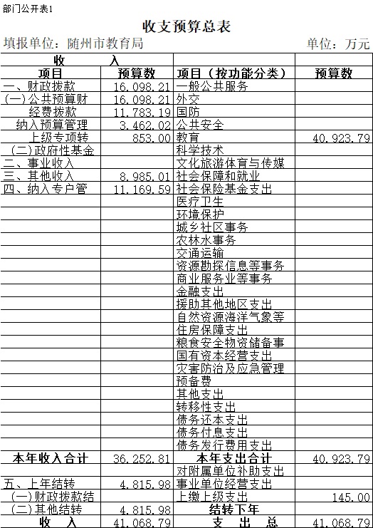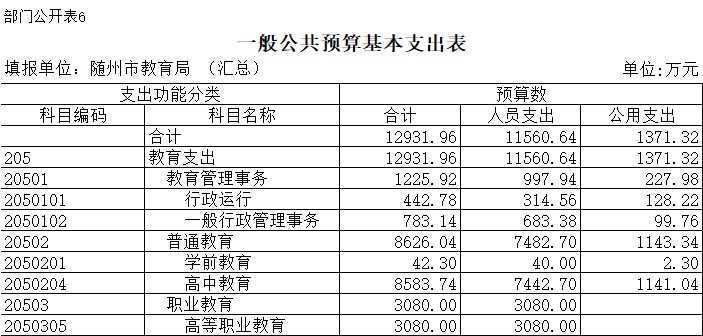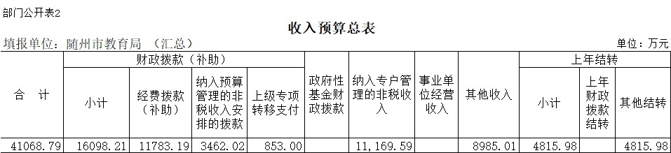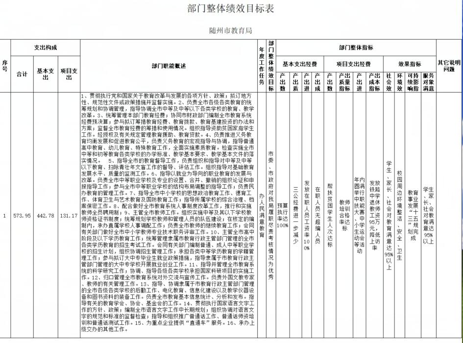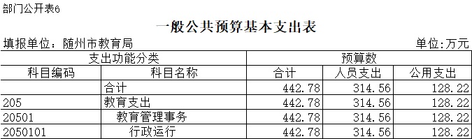 隨州市教育局2019年預算單位構成為:教育局機關,隨州市教育考試中心、隨州市教研室、隨州市電教館、隨州市中小學教師(校長)繼續教育中心、隨州市學生資助管理中心5個二級單位,隨州一中、隨州二中、湖北現代教育集團、隨州市幼兒園4個直屬學校和隨州職業技術學院。
