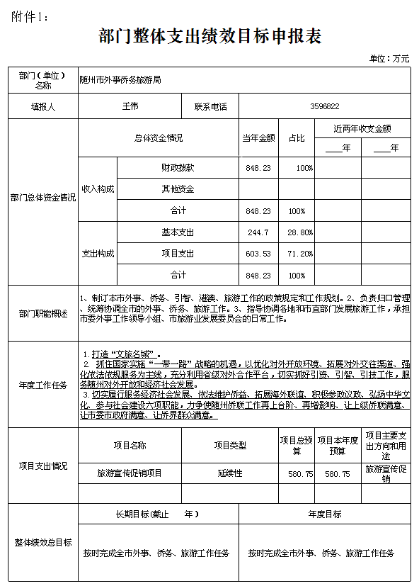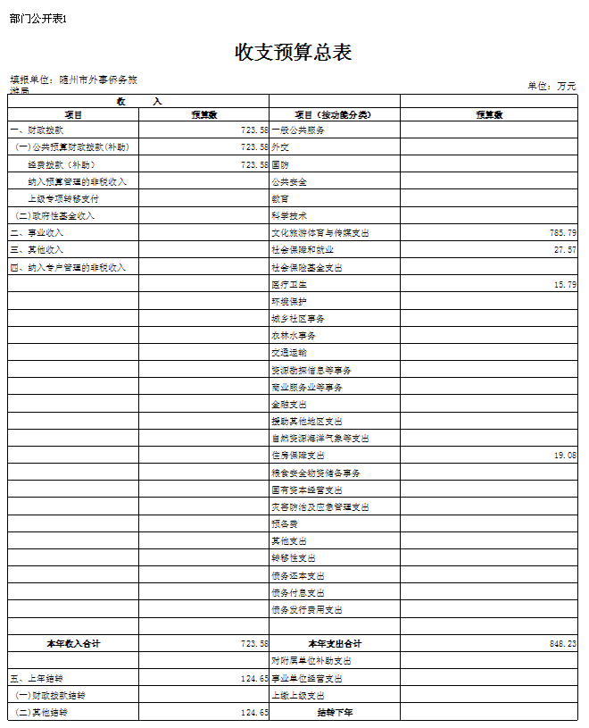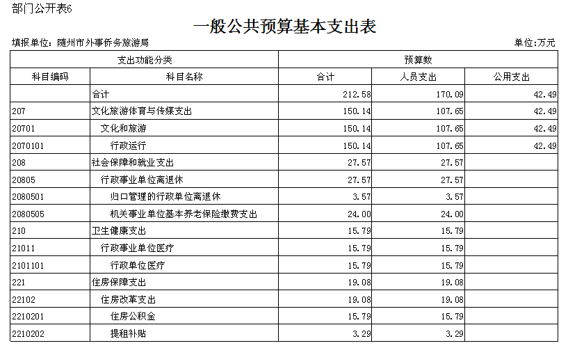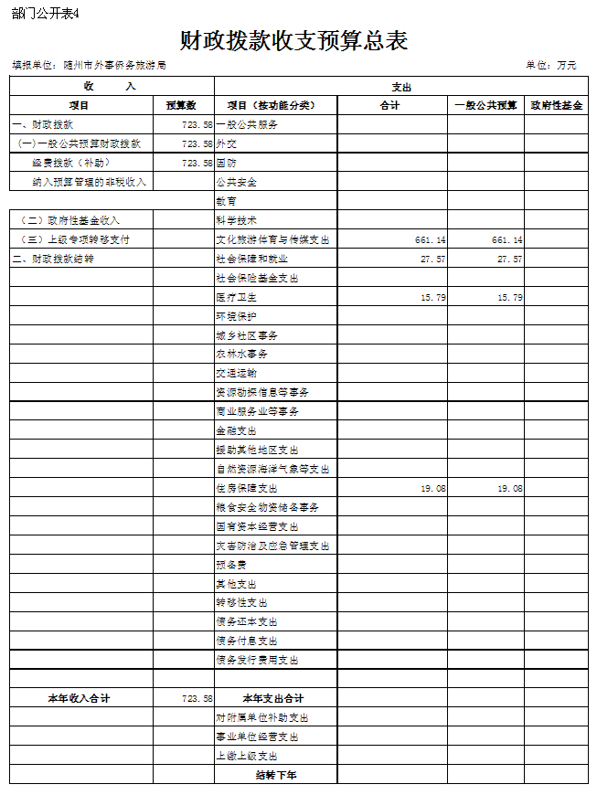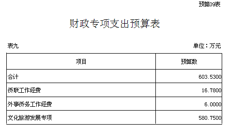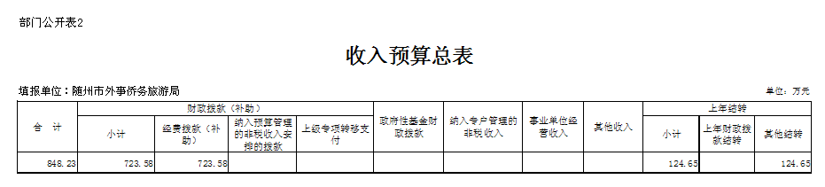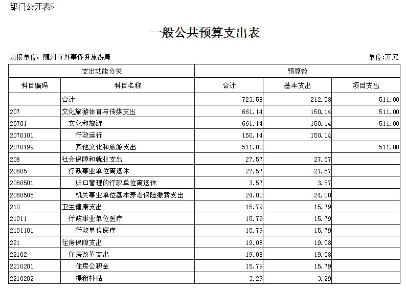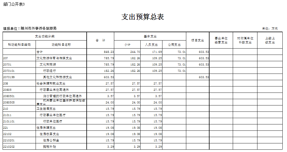 ? 依據(jù)《隨州市財(cái)政局關(guān)于下達(dá)2019年市直部門預(yù)算的通知》,2019年隨州市外事僑務(wù)旅游局預(yù)算指標(biāo)如下: