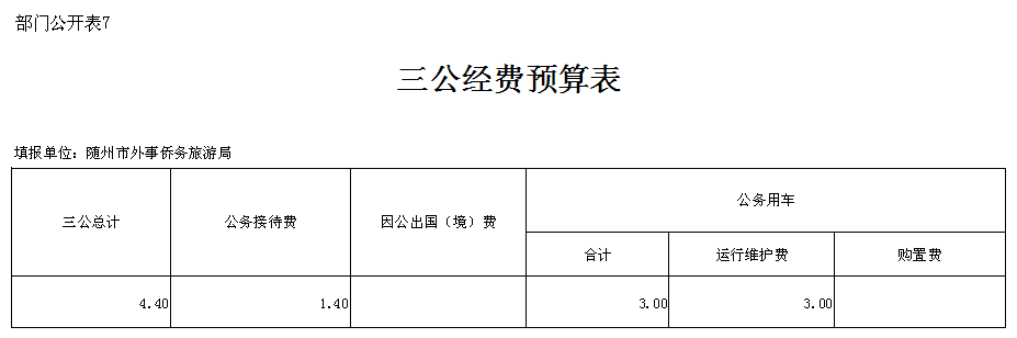 ? 2019年隨州市外事僑務(wù)旅游局“三公”經(jīng)費(fèi)年初預(yù)算4.4萬元。其中: