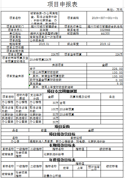 ? ? ? ?2019年執(zhí)法局系統(tǒng)匯總政府采購(gòu)預(yù)算總額為1997.85萬(wàn)元,比上年增加1229.2萬(wàn)元,增加了159.92%,主要原因是增加了政府購(gòu)買服務(wù)預(yù)算—垃圾場(chǎng)滲濾液處理外包托管費(fèi)594萬(wàn)元及局機(jī)關(guān)本級(jí)增加的政府采購(gòu)項(xiàng)目。