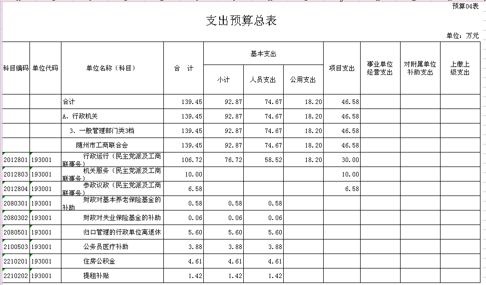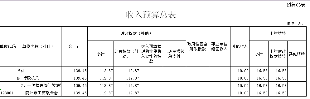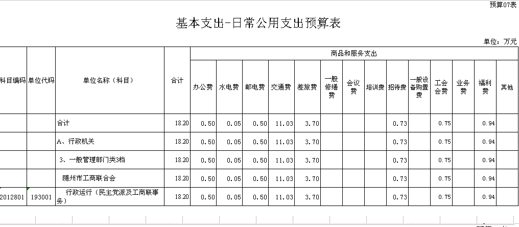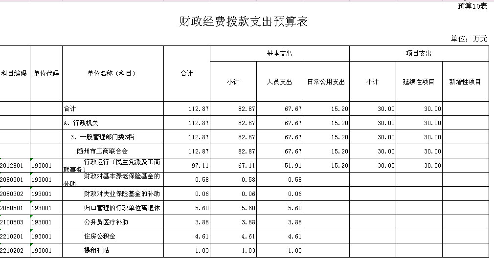 | 193001 | ????隨州市工商聯(lián)合會(huì) | 21.76 | 11.76 | 0.73 | 0.73 | 10.00 | 11.03 | 11.03 | 11.03 | 11.03 | |||