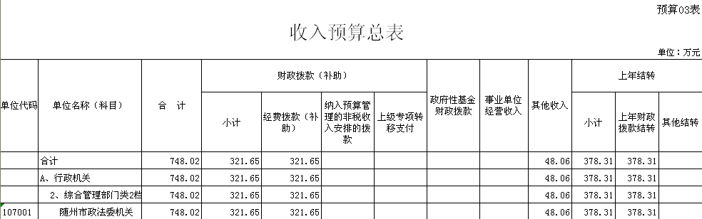 ????2016年市委政法委收入預算總額為748.02萬元,均為財政撥款(補助)收入,其中:財政撥款(補助)收入321.65萬元,上年財政結轉378.31萬元。支出預算總額為748.02萬元,其中:基本支出263.81萬元,項目支出484.21萬元。