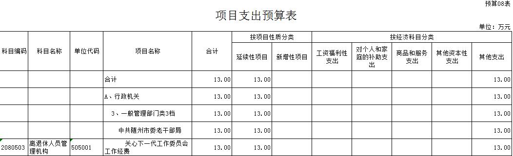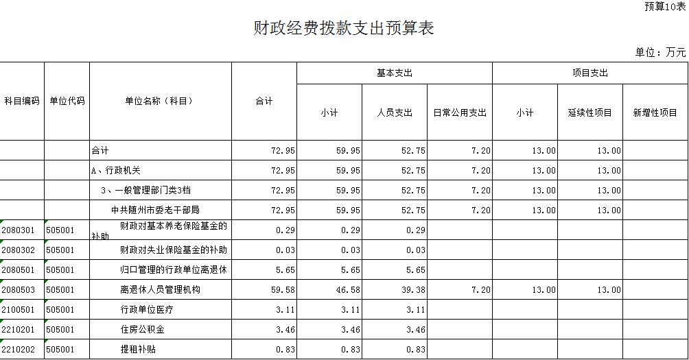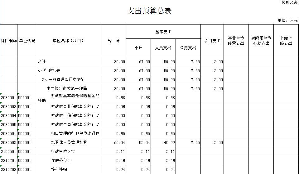 2、支出預算情況。2016年,支出預算金額80.30萬元,其中基本支出67.30萬元、項目支出13萬元。基本支出中,人員支出59.95萬元,公用支出7.35萬元;根據上級老干部工作部門安排部署和本年度重點工作,對5項重點工作項目經費預算據實測算,合理確定預算;辦公費、郵電費、水電費、差旅費等公用經費,嚴格按部門分類分檔定額預算。