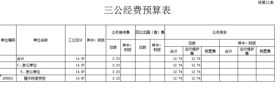 “三公”經費財政撥款支出預算數14.97萬元,其中因公出國(境)費0萬元,公務接待費2.23萬元,公務用車運行費12.74萬元,無公務用車購置費。三公經費比上年減少0.07萬元,減少原因是公務接待預計減少。