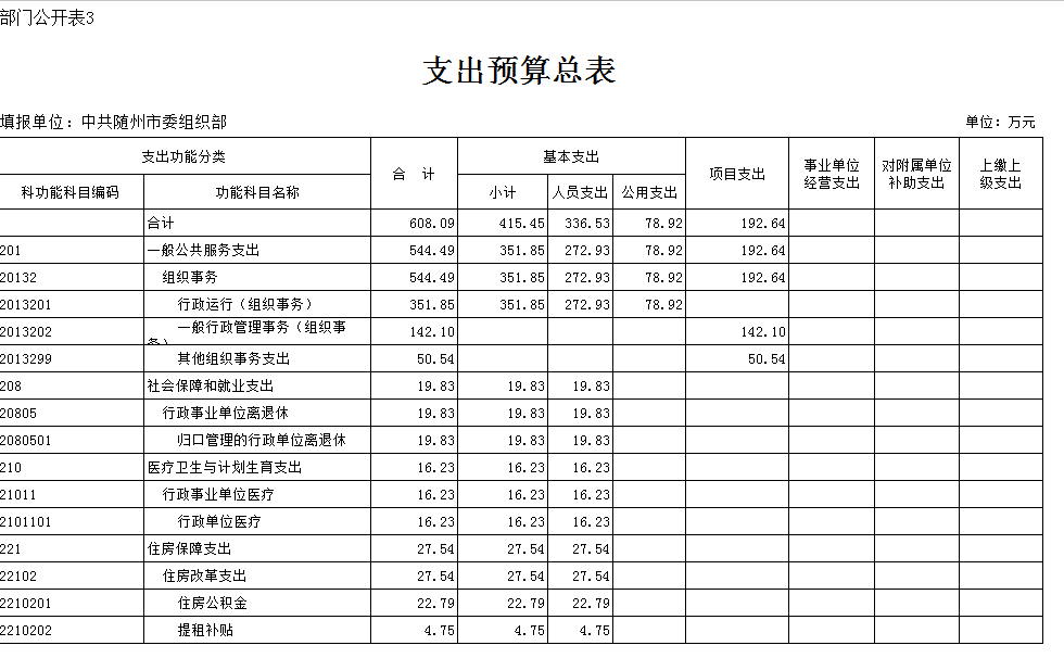 ??市委組織部機關支出預算金額608.09萬元,其中基本支出415.45萬元、項目支出192.64萬元?;局С鲋校藛T支出336.53萬元,公用支出78.92萬元。按功能科目分類,一般公共服務支出544.49萬元、社會保障和就業支出19.83萬元、醫療衛生與計劃生育支出16.23萬元、住房保障支出27.54萬元。