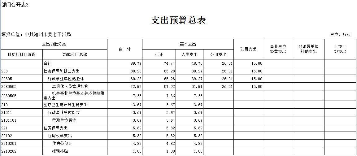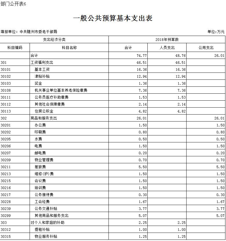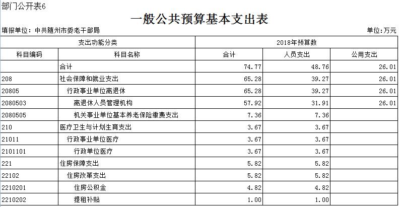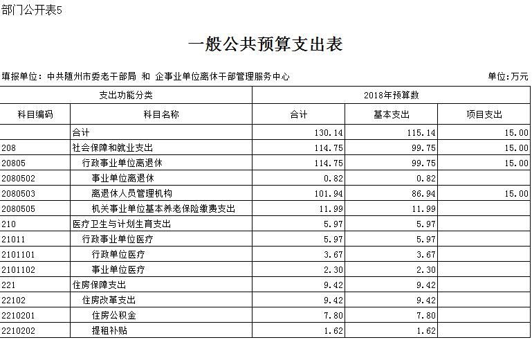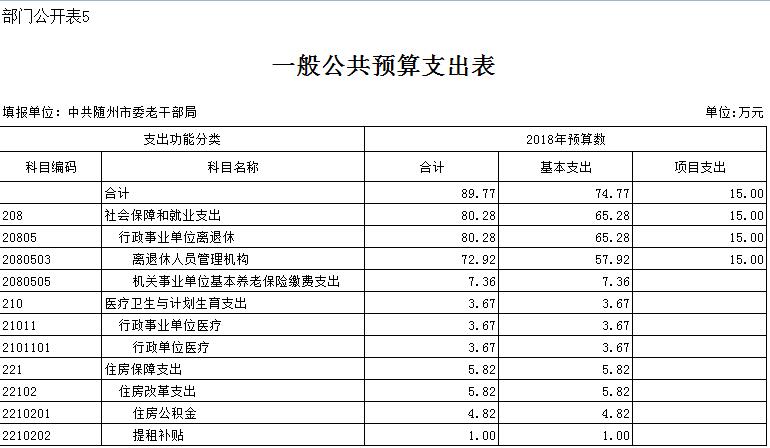 2、隨州市委老干部局(機關)2018年財政撥款支出預算89.77萬元,較去年減少22.01萬元,減少19.69%。減少原因主要為退休人員工資納入養(yǎng)老保險支付。
