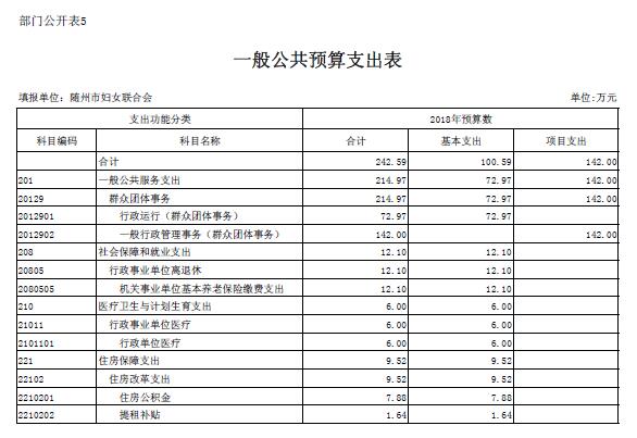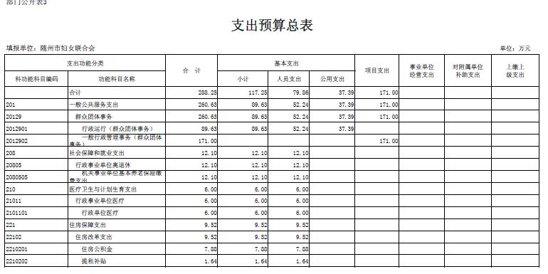 2018年支出預算總額為288.25萬元,較上年417.12萬元減少128.87萬元,減少30.90%。其中按功能分類,行政運行89.63萬元,比上年144.56萬元減少54.93萬元,減少37.998%,一般行政管理事務支出171萬元,比上年一般行政管理業務和其他群眾團體事務合計支出的231.78萬元減少60.78萬元,減少26.22%,社會保障就業支出12.1萬元,醫療衛生支出6萬元,住房公積金支出7.88萬元,提租補貼1.64萬元。主要原因是:壓縮了婦聯工作項目經費。