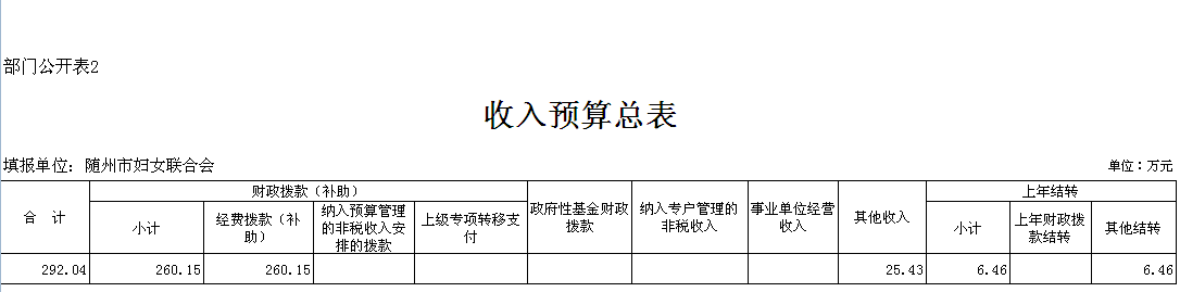 2019年財政撥款收入預算總額為292.04萬元,其中:財政撥款285.58萬元(其中:財政撥款收入260.15萬元,其他收入25.43萬元),上年結轉6.46萬元。較上年預算安排的288.25 萬元增加3.79萬元,增加1.31%。增加原因是上年結轉金額減少,財政增加了婦女工作經費。其中:財政撥款(補助)收入260.15萬元,較上年242.59萬元增加17.56萬元,增加7.24%;其中其他收入25.43萬元,為省婦聯撥付的兩癌救助金。增加原因是省婦聯增加了貧困婦女兩癌救助金。