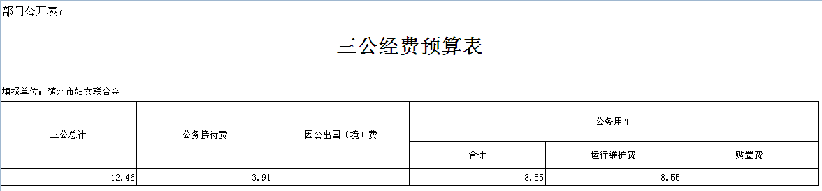 2019年市婦聯“三公”經費年初預算安排12.46萬元,比上年度8.27萬元增加1.51萬元,同比增加18.22%。其中:出國(境)費用0萬元,公務車運行及維護費8.55萬元,公務接待費3.91萬元。