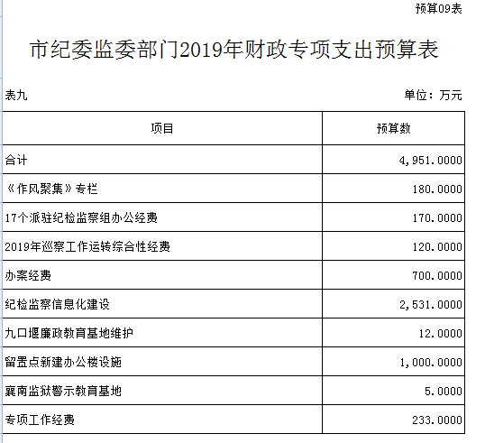 系統匯總:2019年市紀委監委財政撥款預算總支出6467.59萬元,較上年增加4085.21萬元,增加比例為171.48%,主要原因是紀檢監察信息化建設及留置點新建辦公樓設施,專項設施預算增加。