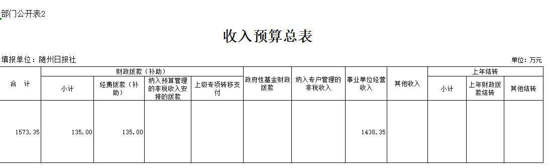 2019年隨州日報社收入預算總額為1573.35萬元,比上年減少76.84萬元,下降4.7%,其中財政撥款135萬元與去年相同,事業單位經營收入1438.35萬元比去年減少76.84萬元。減少主要原因為附屬子公司經營狀況受限,上交任務款延后。