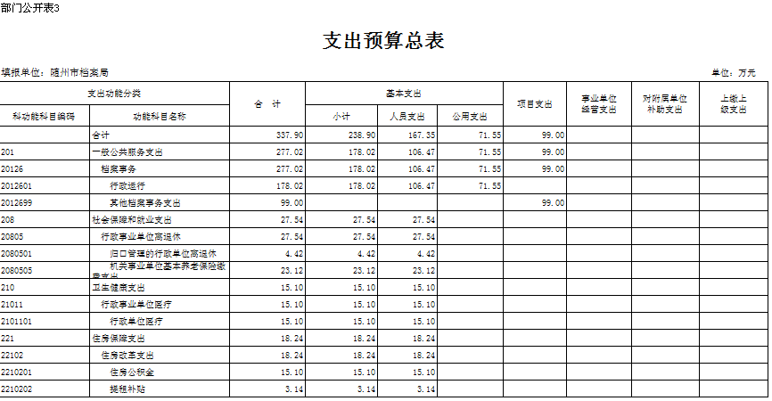 本年部門支出預算總額3370.90萬元,其中:行政運行預算金額178.02萬元(其中人員支出106.47萬元、公用支出71.55萬元)其他檔案事務支出項目預算金額99.00萬元、歸口管理的行政單位離退休預算金額4.42萬元、機關事業單位基本養老保險繳費支出預算金額23.12萬元、行政單位醫療預算人員支出金額15.10萬元、住房公積金預算金額15.10萬元、提租補貼預算金額3.14萬元。較上年預算安排減少了81.52萬元,比上年預算安排減少了19.44%,主要原因為減少了項目預算經費支出。