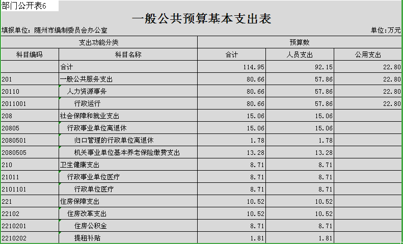 本部門公用經(jīng)費(fèi)支出預(yù)算合計38.15萬元,比上年增加0.86萬元,增長2%,主要是因為機(jī)構(gòu)編制改革任務(wù)加重。支出科目主要包括辦公及印刷費(fèi)、郵電費(fèi)、差旅費(fèi)、會議費(fèi)、福利費(fèi)、日常維修費(fèi)、專用材料及一般設(shè)備購置費(fèi)、辦公用房水電費(fèi)、辦公用房取暖費(fèi)、辦公用房物業(yè)管理費(fèi)、公務(wù)用車運(yùn)行維護(hù)費(fèi)以及其他費(fèi)用。辦公費(fèi)預(yù)算2.6萬元,印刷費(fèi)預(yù)算1.7萬元,水費(fèi)預(yù)算0.08萬元,電費(fèi)預(yù)算1.3萬元,郵電費(fèi)預(yù)算1.08萬元,差旅費(fèi)預(yù)算2.55萬元,維修(護(hù))費(fèi)預(yù)算1.2萬元,會議費(fèi)預(yù)算0.8萬元,培訓(xùn)費(fèi)預(yù)算0.48萬元,公務(wù)接待費(fèi)預(yù)算0.75萬元,工會經(jīng)費(fèi)預(yù)算1.59萬元,福利費(fèi)預(yù)算1.43萬元,公務(wù)交通補(bǔ)貼預(yù)算6.8萬元,其他商品和服務(wù)支出預(yù)算0.44萬元,對個人和家庭的補(bǔ)助1.78萬元。