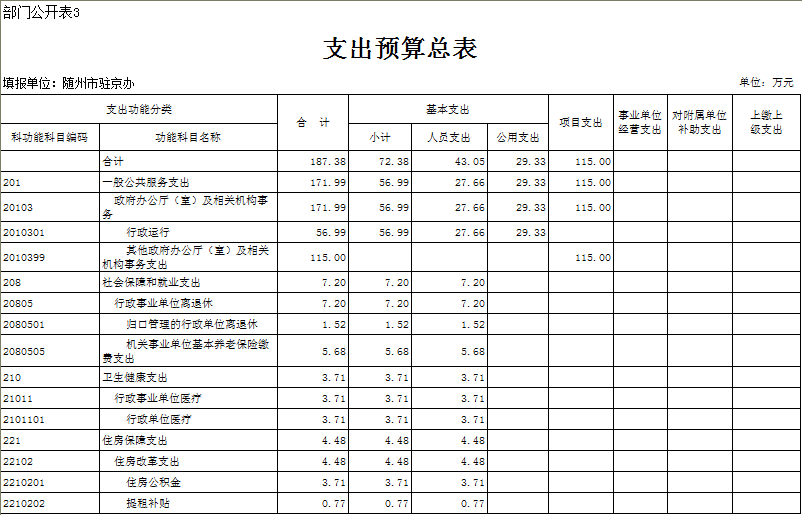 本年部門支出預算總額187.38萬元,其中:行政運行(政法)預算金額72.38萬元(其中人員支出43.05萬元、公用支出29.33萬元)、項目支出115萬元。與上年持平。