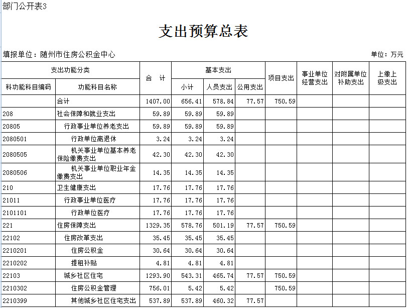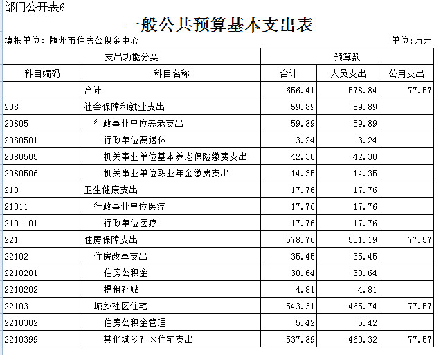 2020年支出預算總額1407萬元,較上年增加287萬元、增加25.63%。其中:基本支出656.41萬元、項目支出750.59萬元。基本支出中人員支出578.84萬元、公用支出77.57萬元。支出總額增加的主要原因:一是公積金專項運營經(jīng)費中新增了隨縣辦事處業(yè)務(wù)用房購房費(尾款)及裝修費。二是人員費用晉級增長。