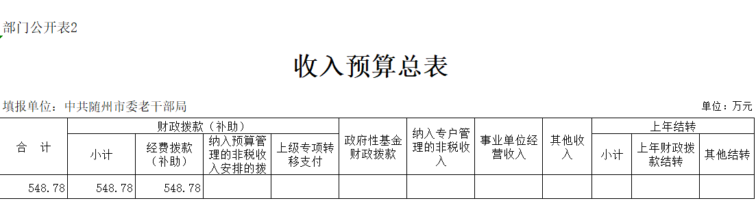 2、隨州市委老干部局(機關)2020年收入預算總額為548.78萬元,全部為財政撥款(補助)收入。較上年預算安排增加372.03萬元,增加210%,增加原因主要為機構改革后,老干部局編制人員增加5人,同時2020年新增300萬項目經費用于老年大學建設,導致預算增加。