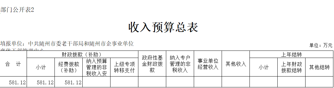 1、隨州市委老干部局(含隨州市企事業單位離休干部管理服務中心)2020年收入預算總額為581.12萬元,全部為財政撥款(補助)收入。較上年預算安排增加372.79萬元,增加179%,增加原因主要為機構改革后,老干部局編制人員增加5人,同時2020年新增300萬項目經費用于老年大學建設,導致預算增加。