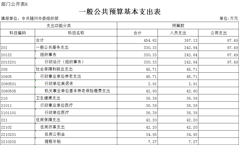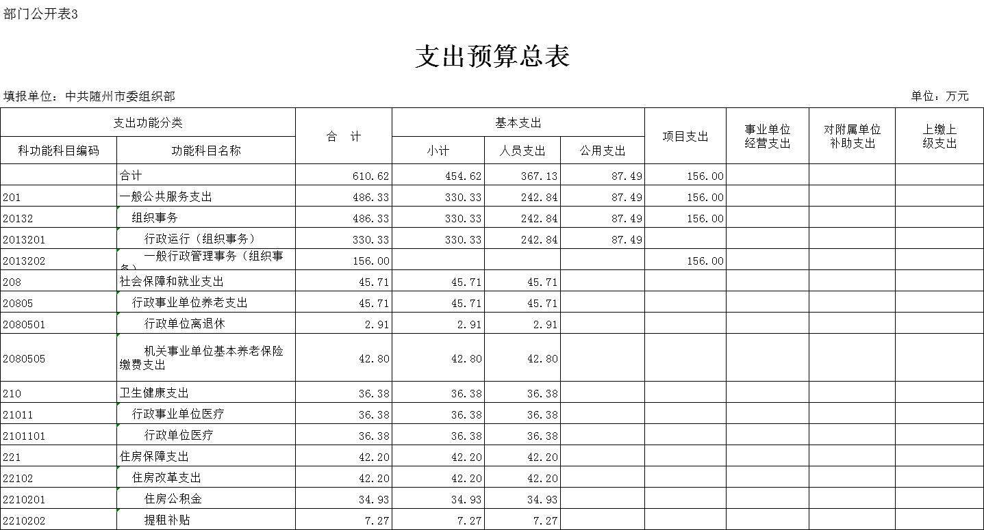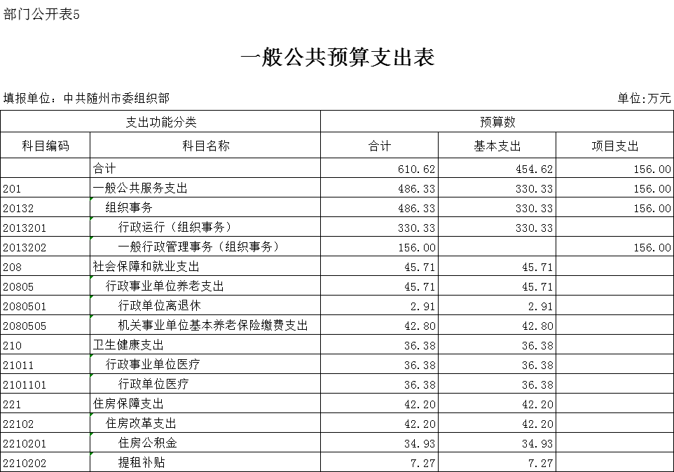 市委組織部部門(本級)支出預算金額610.62萬元,較上年增加141.37萬元,增加30.12%,增加的主要原因是機構改革后,公務員局并入組織部統一管理,人員經費和公用經費相應增加。其中基本支出454.62萬元、項目支出156萬元。基本支出中,人員支出367.13萬元,公用支出87.49萬元。按功能科目分類,一般公共服務支出330.33萬元、社會保障和就業支出45.71萬元、醫療衛生與計劃生育支出36.38萬元、住房保障支出42.2萬元。