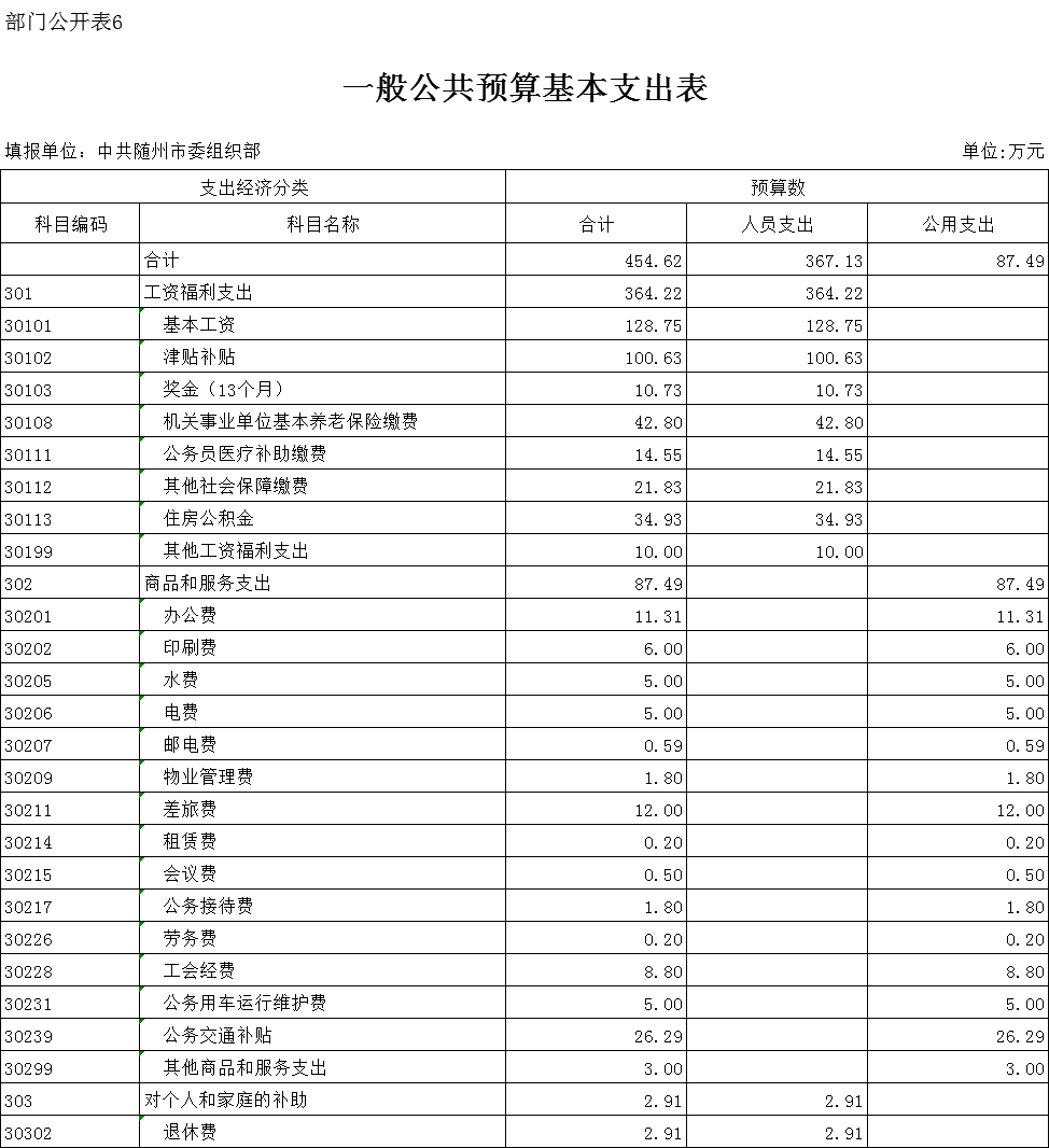市委組織部本級87.49萬元,較上年增加1.19萬元,增加1%,主要原因是根據機關辦公需要合理測算,適當增加預算支出。主要支出科目:辦公及印刷費17.31萬元、水電費10萬元、郵電費0.59萬元、差旅費12萬元、會議費0.5萬元、公務接待費1.8萬元、工會經費8.8萬元、公務用車運行維護費5萬元、公務交通補貼26.29萬元、其他支出5.2萬元。