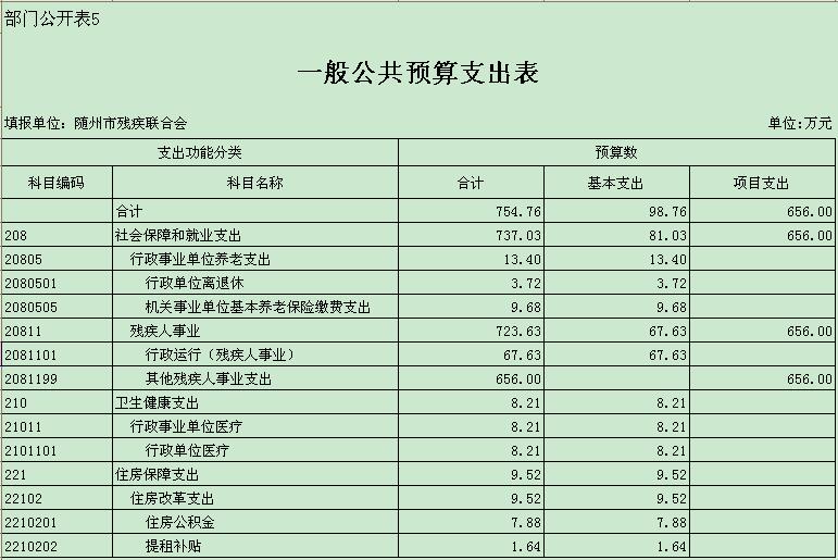 2210201 住房保障支出(類)住房改革支出(款)住房公積金(項):指隨州市殘疾人聯合會按照人力資源和社會保障部、財政部規定的基本工資和津貼補貼以及規定比例為職工繳納的住房公積金。