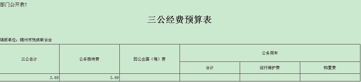 2020年隨州市殘聯(本級)“三公”經費年初預算安排2.69萬元(財政撥款補助預算0.69萬元),與2019年財政安排的3.39萬元減少0.7萬元,同比減少21%,因為今年細化了項目接待科目和壓縮支出。其中: