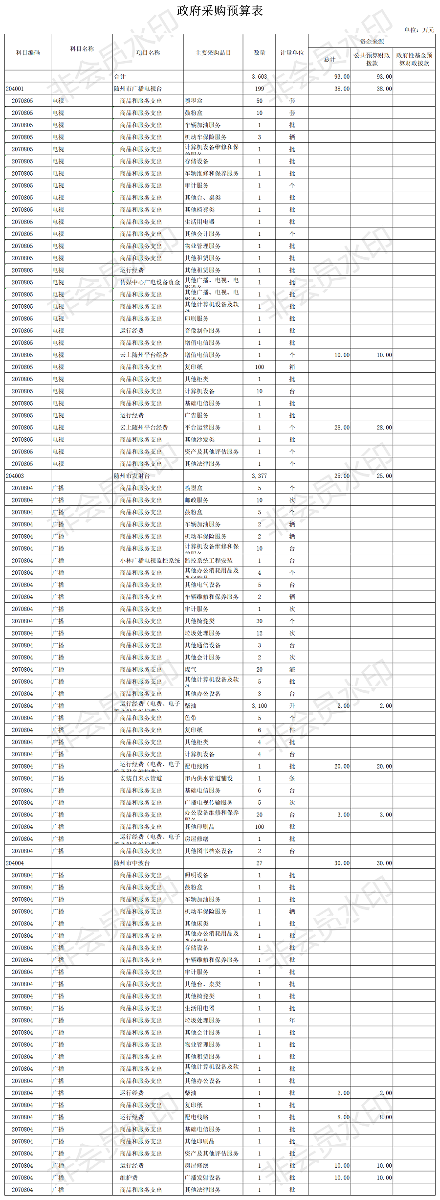 ?隨州廣播電視臺2020年系統及本級政府采購預算總額為93萬元,其中隨州廣播電視臺本級38萬元,隨州市電視調頻發射臺25萬元,隨州市中波實驗臺30萬元。政府采購貨物預算10萬元,服務預算73萬元,工程預算10萬元,較上年預算安排(1408.1萬元)減少1315.1元,減少93.4%,原因是減少了傳媒中心廣電設備購置的政府采購預算。其中,隨州廣播電視臺本級較上年預算安排(1379.5萬元)減少1341.5萬元,減少97.24%,原因是減少了傳媒中心廣電設備購置的政府采購預算。?