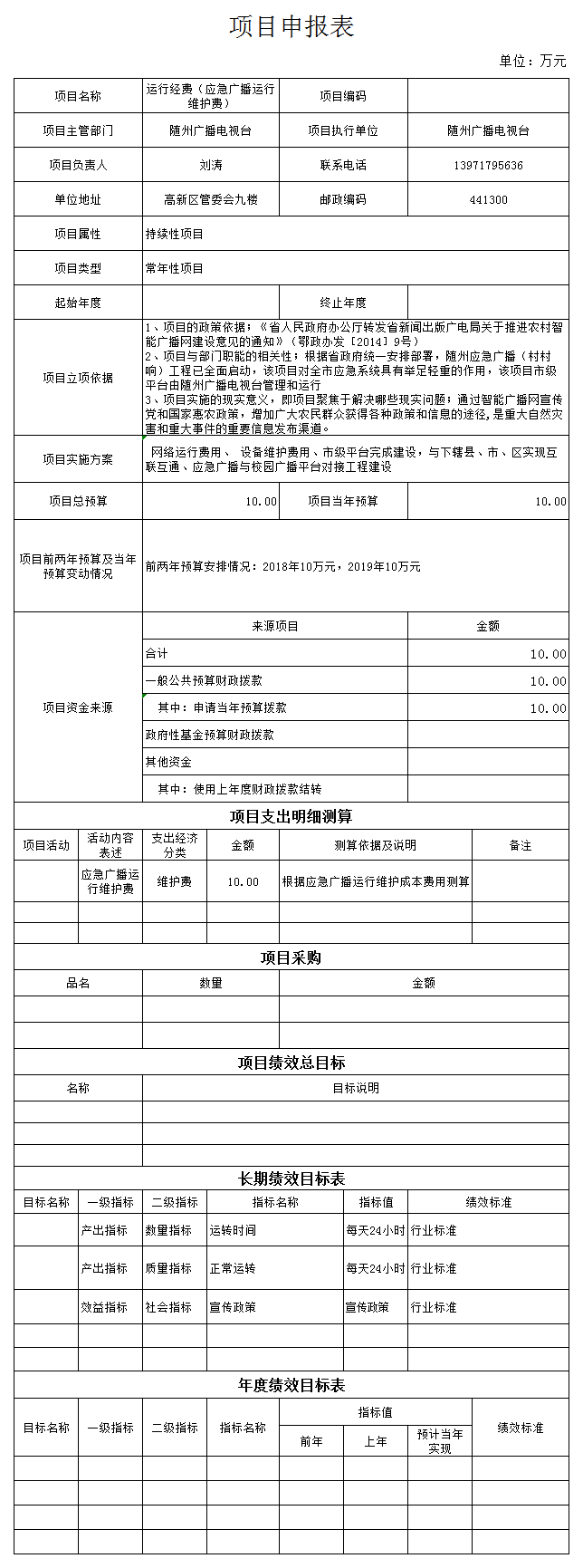 應急廣播市級平臺運行維護費10萬元,用于支付應急廣播的網絡運行費用、設備維護費用等。我臺根據《省人民政府辦公廳轉發省新聞出版廣電局關于推進農村智能廣播網建設意見的通知》(鄂政辦發【2014】9號)統一安排部署,隨州應急廣播(村村響)工程已全面啟動,該項目對全市應急系統具有舉足輕重的作用,通過智能廣播網宣傳黨和國家惠農政策,增加廣大農民群眾獲得各種政策和信息的途徑,是重大自然災害和重大事件的重要信息發布渠道。根據行業標準,設定數量指標為:運轉時間24小時/天;質量指標為:每天24小時正常運轉;效益指標為:宣傳國家政策。