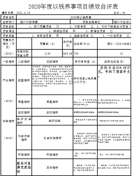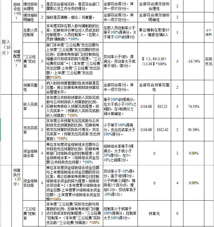 3.預(yù)算執(zhí)行率為91.56 %。我處通過(guò)自評(píng),2020年度整體支出績(jī)效目標(biāo)完成較好,但還存在預(yù)算執(zhí)行率未達(dá)到100%的情況。本次我處整體支出績(jī)效指標(biāo)數(shù)據(jù)來(lái)源于財(cái)政對(duì)我處的2020年預(yù)算批復(fù)文本及2020年度賬面實(shí)際發(fā)生的數(shù)據(jù)。